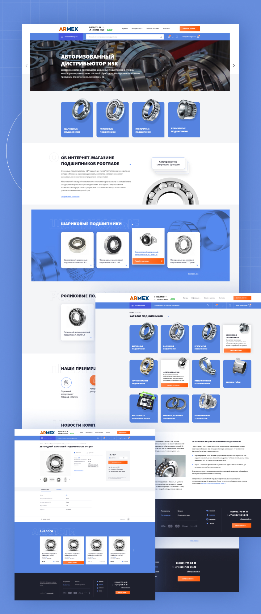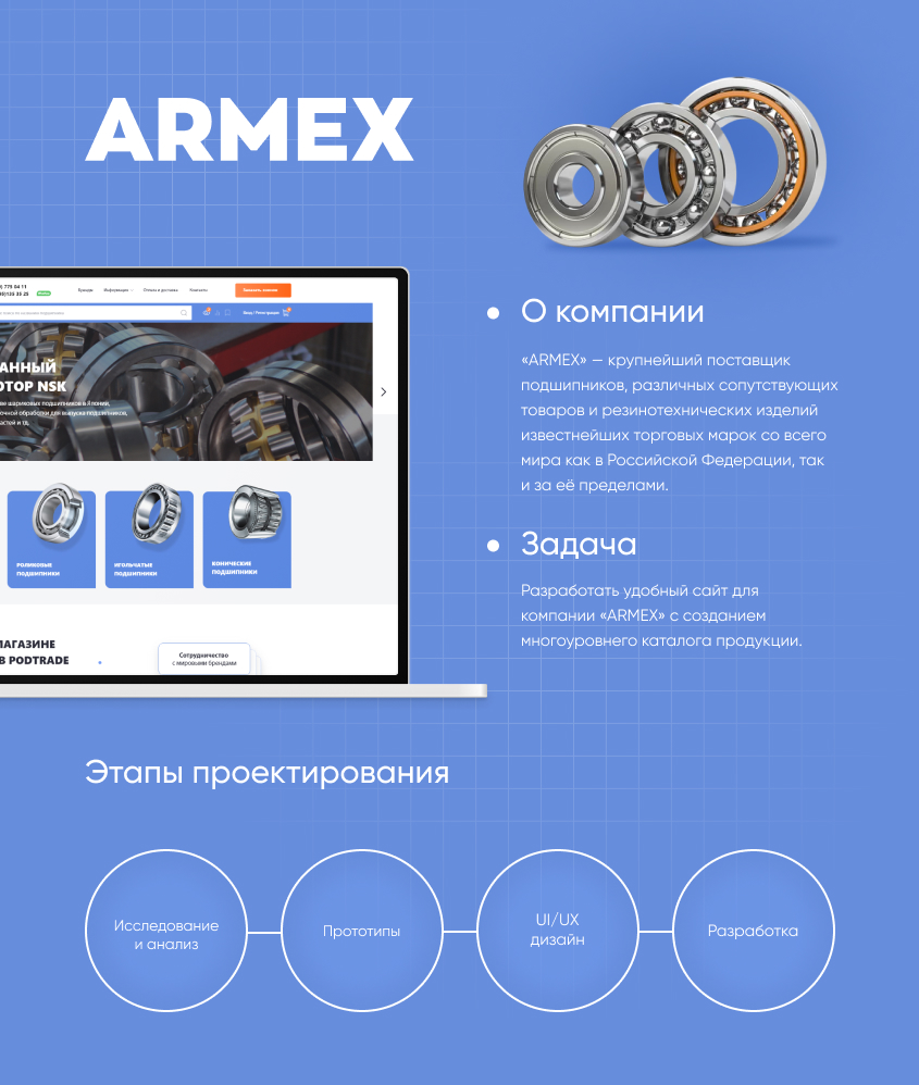 Компания «Armex» занимается поставками подшипников, резинотехнических изделий от известных мировых брендов по России и за ее пределами. Наша веб-студия взяла на себя все работы по разработке сайта с большим и подробным каталогом продукции и стильным дизайном для этой компании .